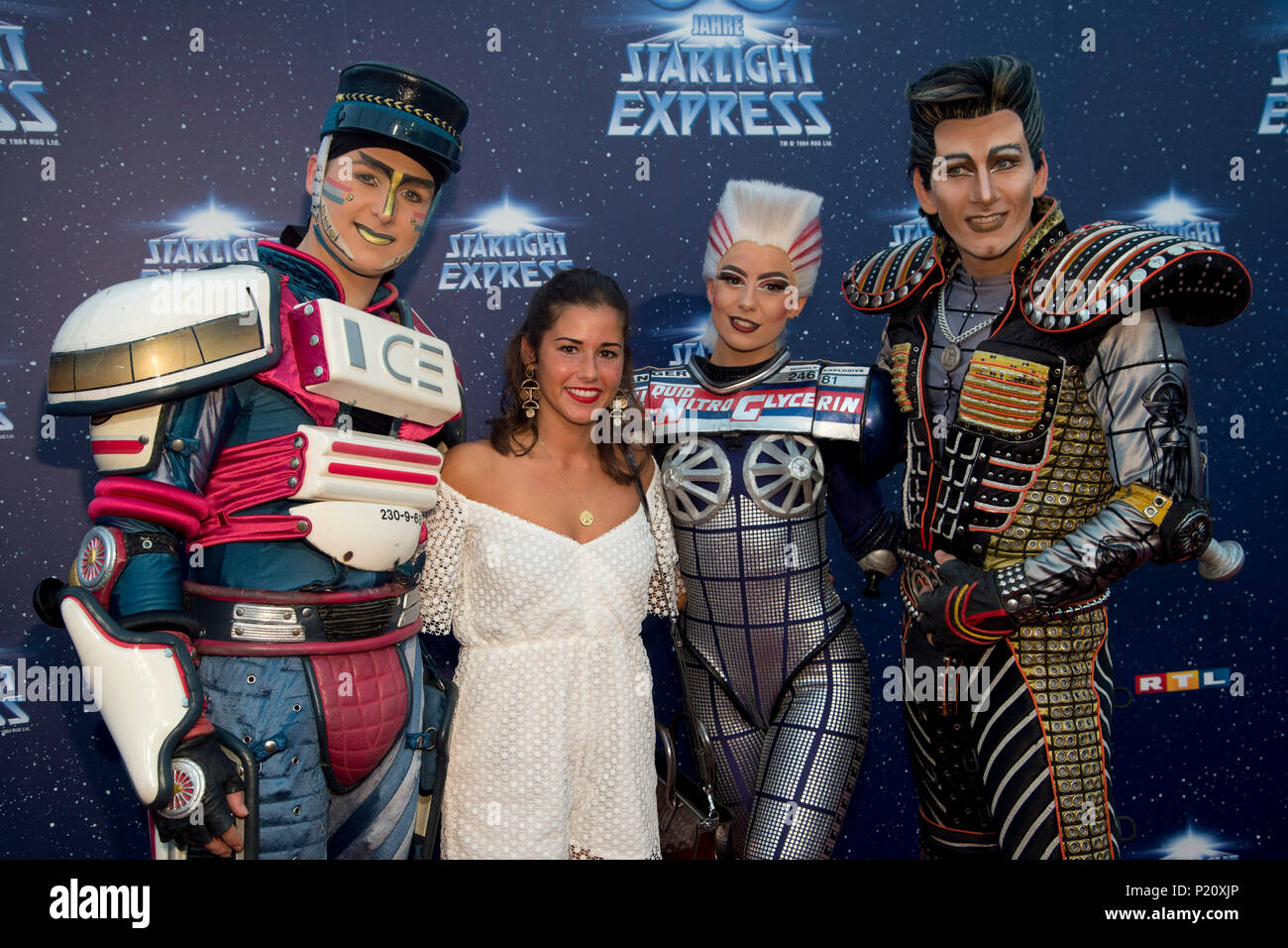 Bochum Deutschland 12 Juni 2018 Sarah Lombardi Sanger Posiert Mit Drei Schauspieler In Den Rollen Greaseball Joule Und Ruhrgold Roter Teppich Red Carpet Show Jubilaeum 30 Jahre Musical Starlight Express Bochum Starlight