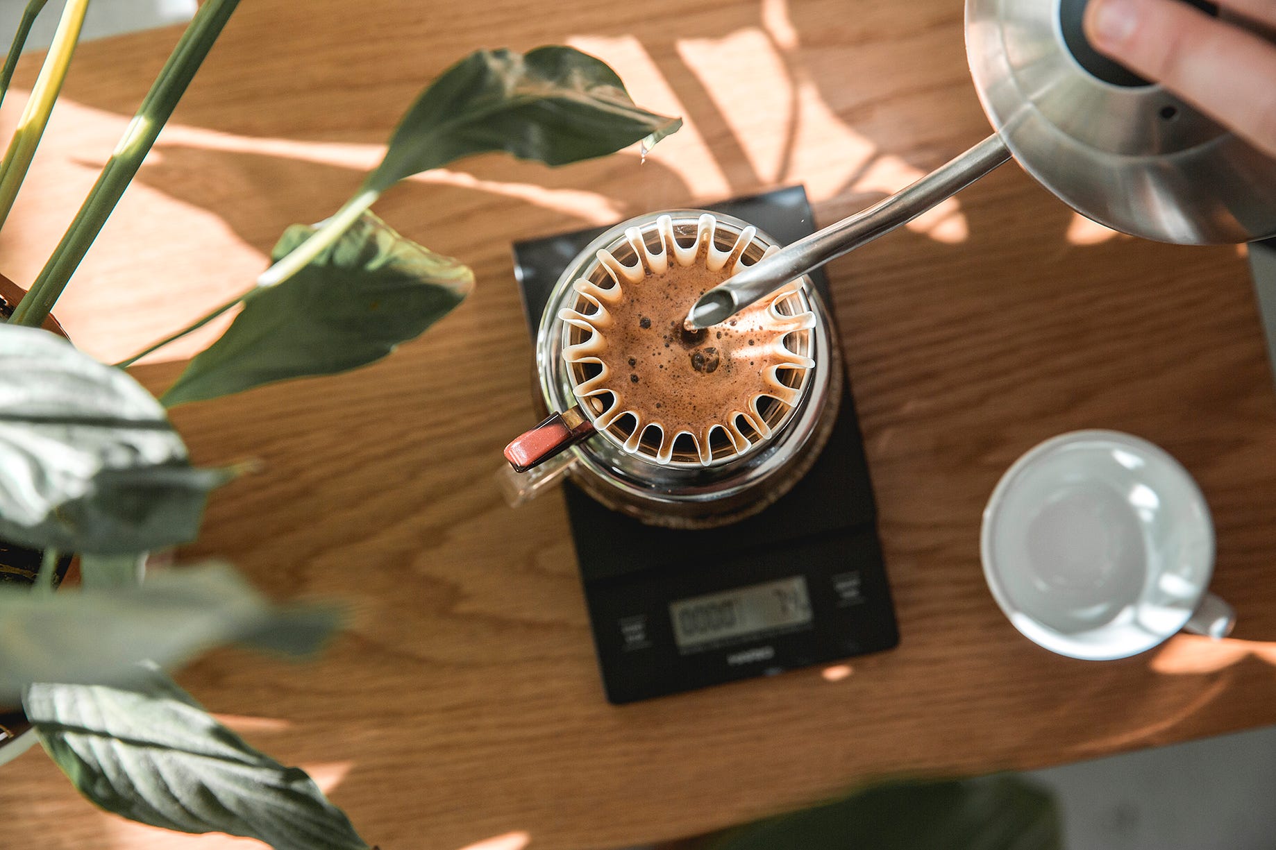 If you open a 1kg bag of coffee and it takes a while to finish it may become bitter before you know it. Grind and pour coffee into V60 rotating the V60 to even out the grounds. A shorter brew time will result in a brighter tasting cup of coffee.